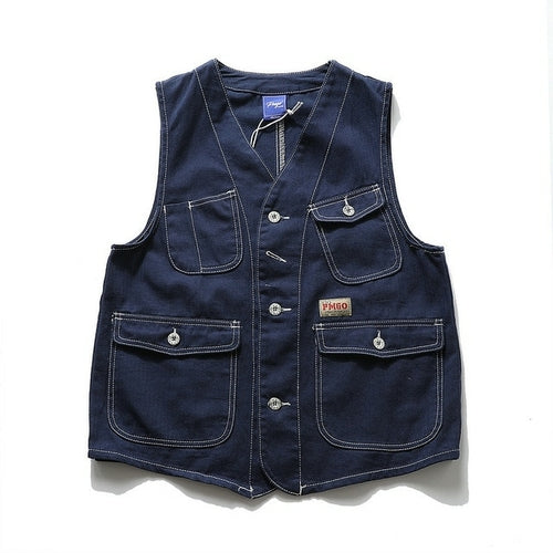 Men Multi Pocket Vest Denim Wavy Japanese Cargo Coats Simple Harajuku